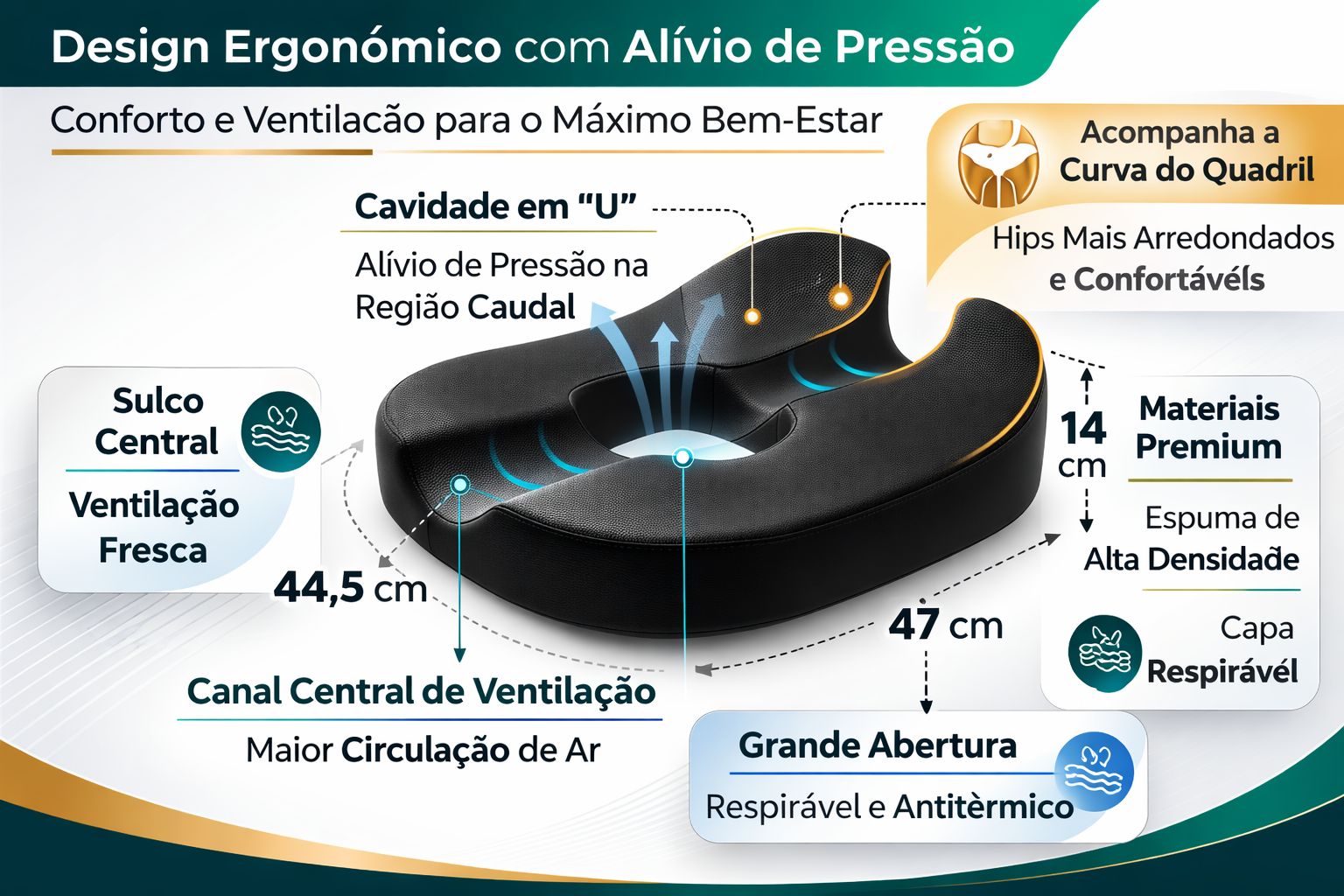 Design Científico: Furo central com bordas contornadas para levantar você efetivamente da superfície do assento.O travesseiro inclina-se gradualmente de trás para frente para que as coxas passem naturalmente do assento.Com recortes em “U” na frente e atrás da almofada Coccyx eleve o seu conforto.